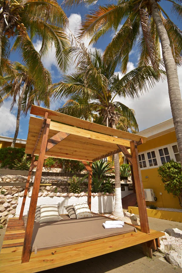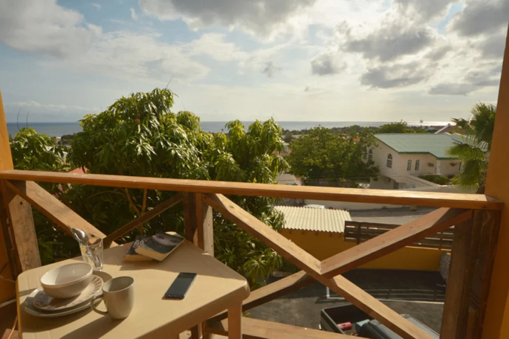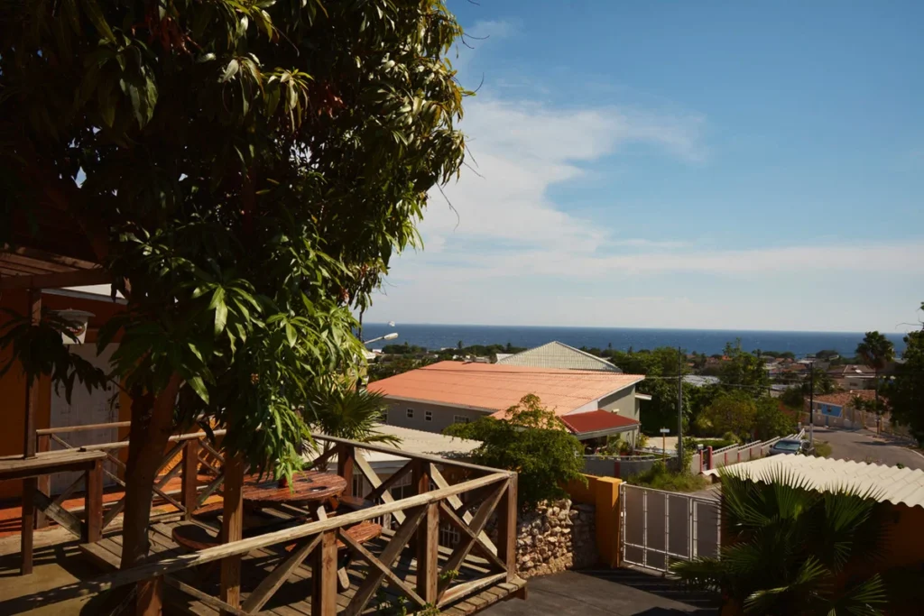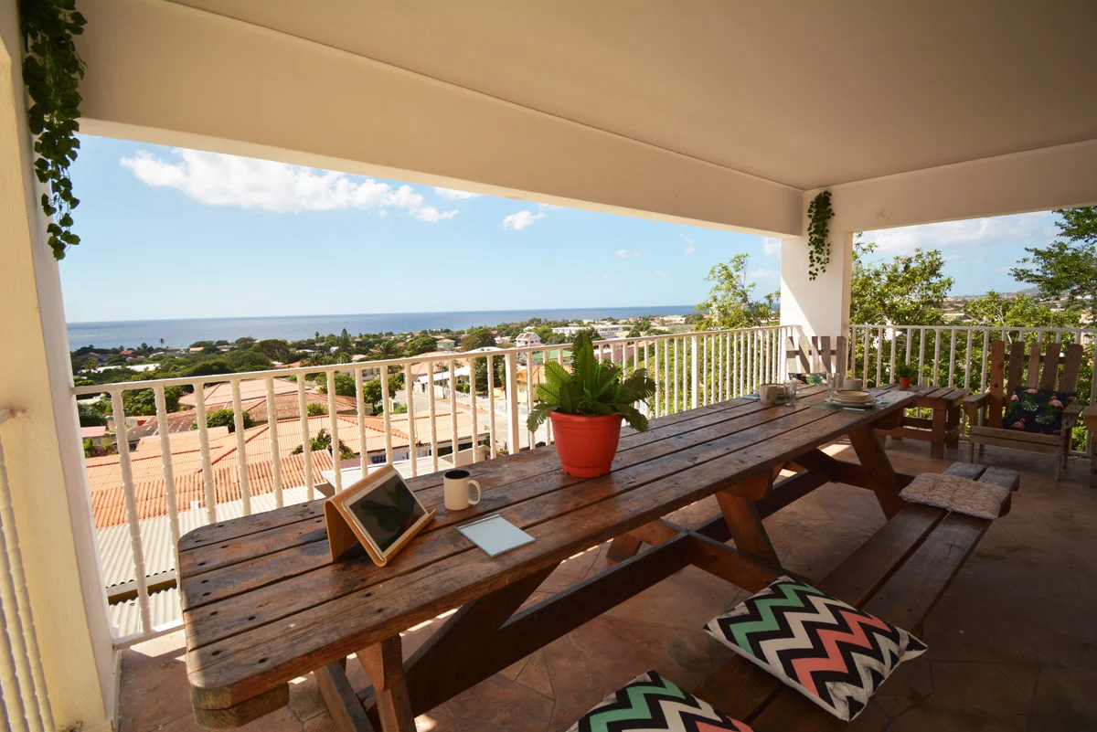 Op het balkon hebben we relaxte houten strandstoelen geplaatst. Hier geniet je van de opkomende zon en overzie je het gehele complex. In de verte kijk je op de Caribische zee en een mooi gedeelte van Curaçao.